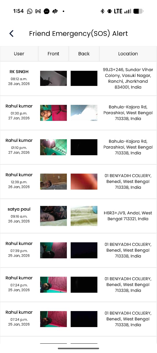 Front/back camera, time and location—auto-shared with trusted contacts.